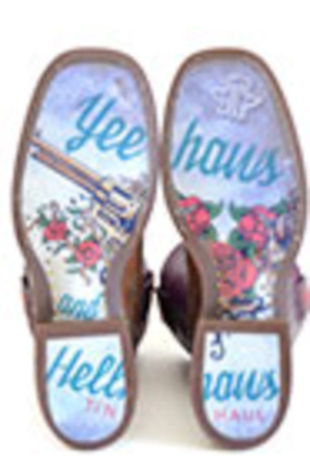 Tin Haul cowboy boots are not for the faint of heart. With a slogan of �Wear Your Metal Out,� these boots are designed to stand out from the crowd. Known for their edgy twist on traditional western boots, each style has its own unique theme. And it�s all in the details! Be sure to check out the soles of the boots, with a colorful graphic covered in a clear patented material. Strut in style with Tin Haul boots. This item features leather materials, bandana shaft, and double welt. Made from premium quality materials, these stylish boots will add a polished look to your western wardrobe.
